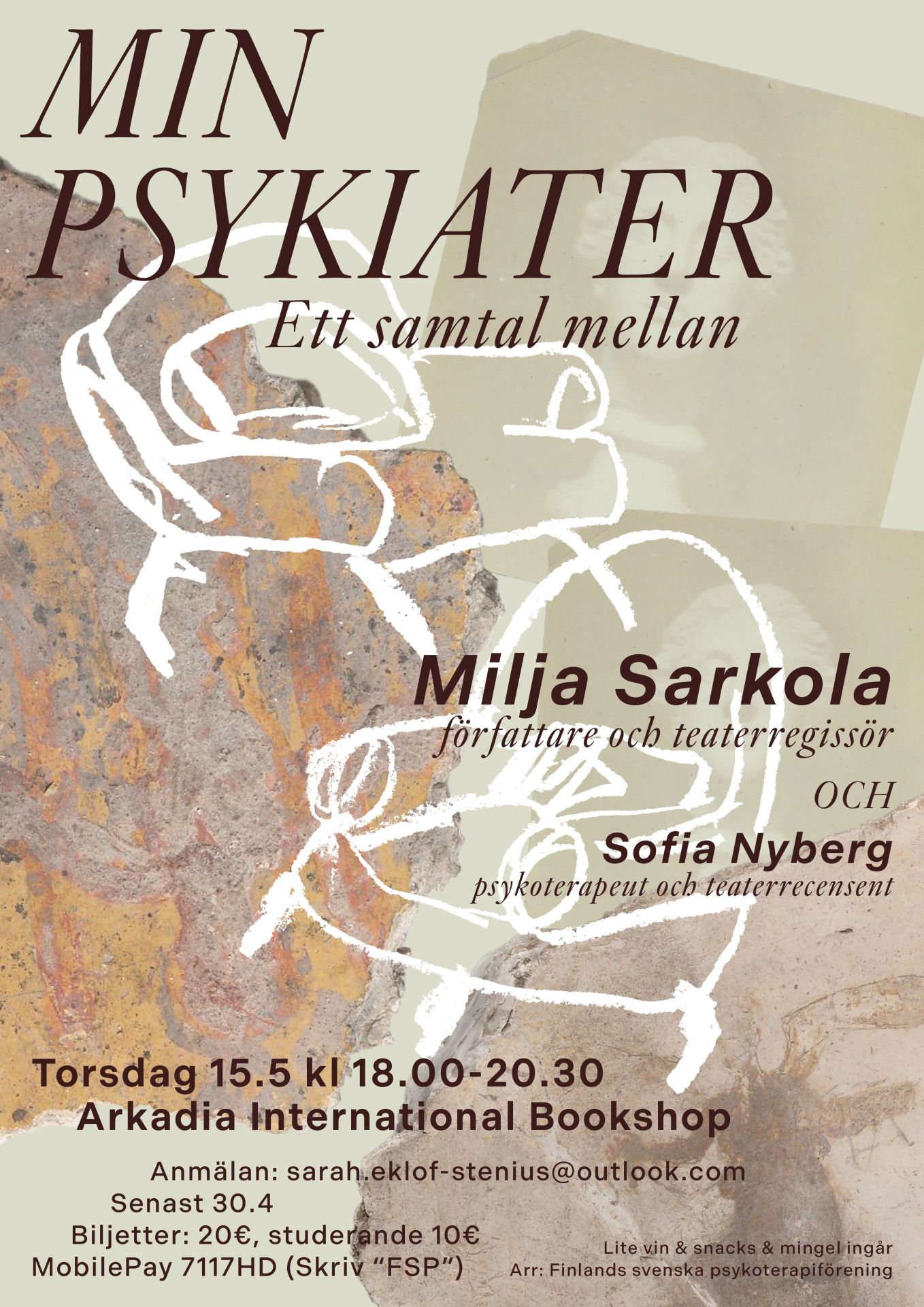 Finlands svenska psykoterapiförening rf har glädjen att bjuda in allmänheten till ett evenemang, där manusförfattare, författare, regissör Milja Sarkola samtalar tillsammans med psykoterapeut, teaterrecensent Sofia Nyberg utifrån Sarkolas roman ”Min psykiater” (2024). Samtalet är det första i en serie där vi med den psykoanalytiska förståelsegrunden som redskap försöker förstå oss själva, konst, kultur och vår samtid.