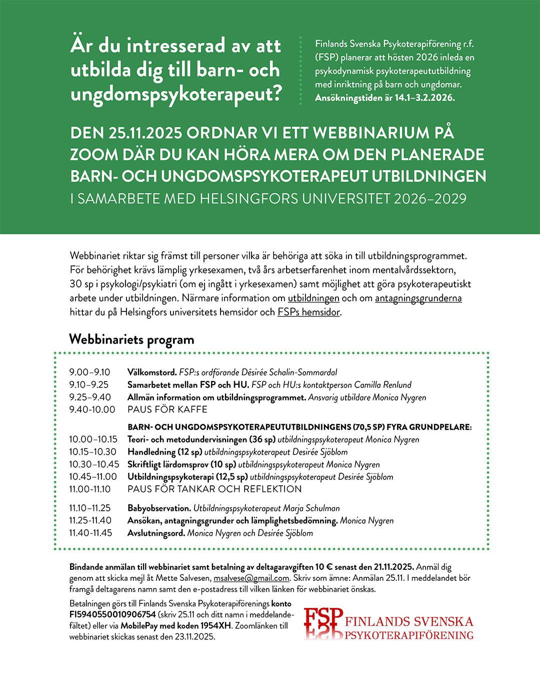 Finlands Svenska Psykoterapiförening ordnar 2022-2026 en psykoterapeututbildning med psykodynamisk inriktning. Utbildningen ger behörighet att erbjuda intensiv individuell psykoterapi till vuxna.